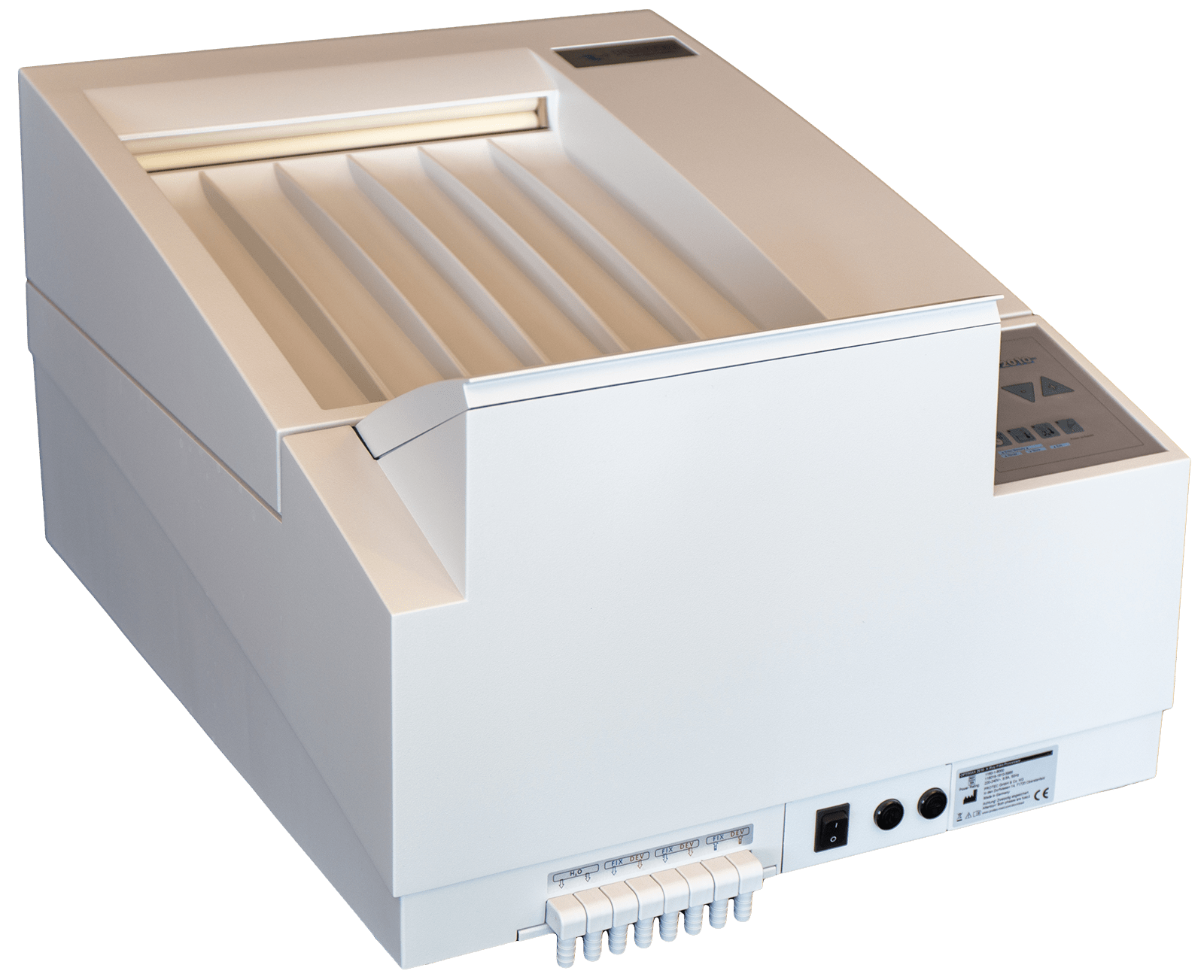 Экспонированная пленка последовательно проходит через различные зоны: проявитель / фиксаж / промывка и сушка. По окончании протяжки пленки машина автоматически переключается в режим ожидания.